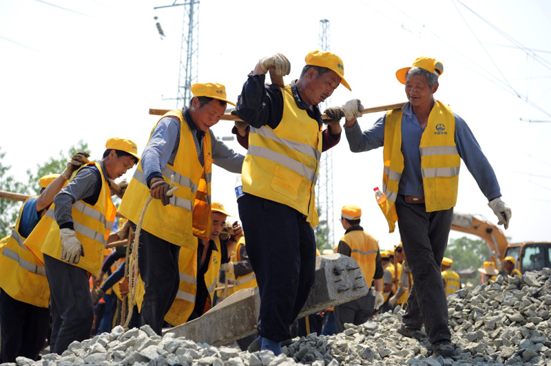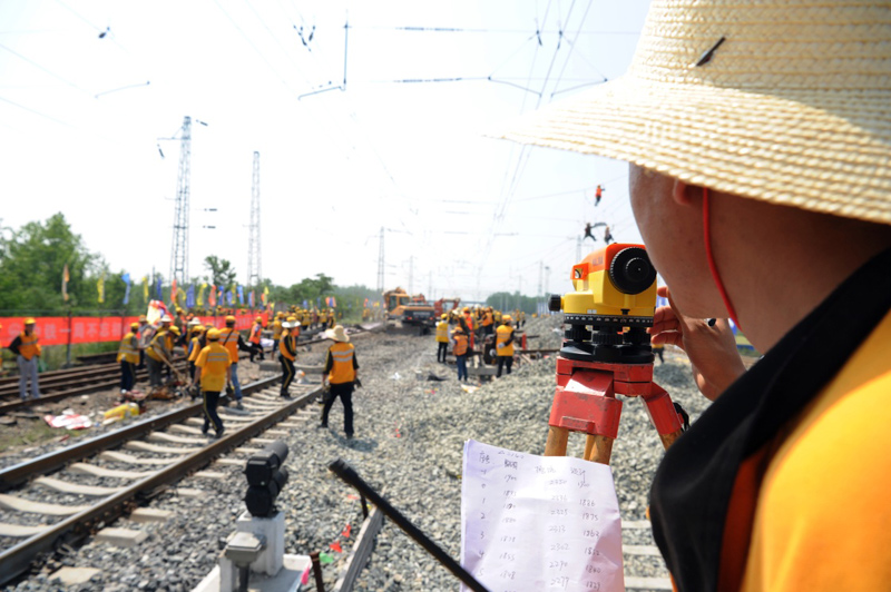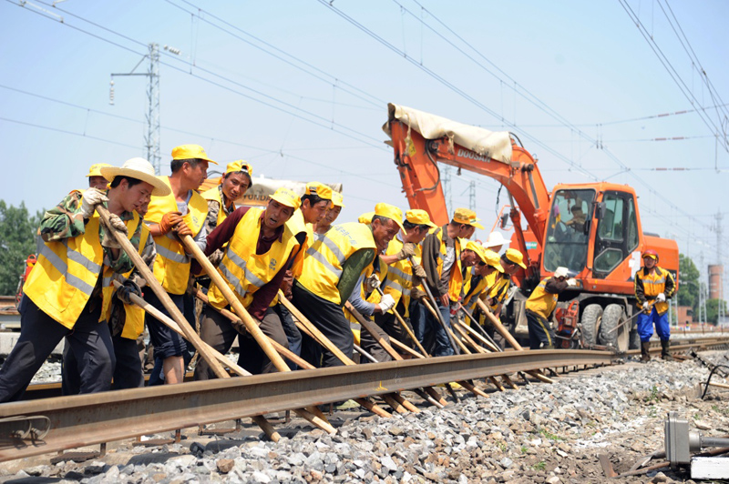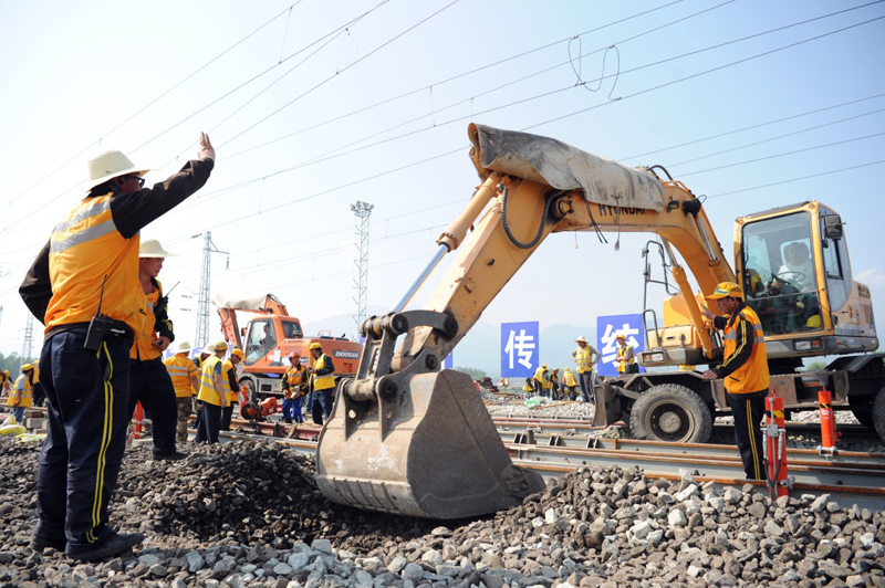 5月16日,工作人员在阳安二线褒河站轨道上施工。
