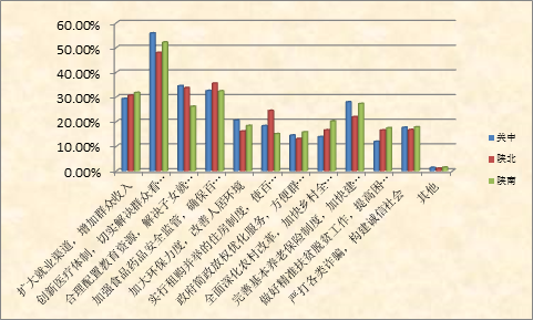 调查结果显示有20.22%的陕南人民愿望是“全面深化农村改革,加快乡村全面振兴”,排在第六位,在关中、陕北人民新年愿望中分别是第十位和第八位。我省陕南地区农村人口较多,特别是农村贫困人口比例较高,陕南人民更期盼政府能够加快农村改革的步伐。