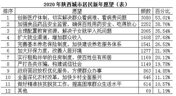 将调查数据按照关中地区六市(区)(西安、铜川、宝鸡、咸阳、渭南、杨凌示范区)、陕北地区两市(延安、榆林)、陕南地区三市(汉中、安康、商洛)分组进行统计分析,分别得出不同区域居民新年愿望,具体见下表: