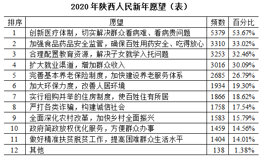 2020年陕西人民新年愿望调查结果揭示了我省万户居民对美好生活的期盼和渴求,也让我们看到了公共服务的短板,各级政府和职能部门只有紧盯这些“短板”,不断努力工作,才能不负群众的期盼,共同谱写出陕西的美好明天。