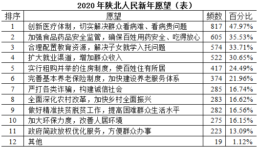 2020年中国将全面建成小康社会,实现第一个百年奋斗目标。2020年也是脱贫攻坚决战决胜之年。在这充满希望的一年里,我省人民有哪些愿望?对党委政府工作有哪些期盼?省统计局经过精心策划,认真组织开展了《2020年陕西人民新年愿望调查》,随机电话访问全省一万户城乡居民,广泛倾听民声、收集民意,了解他们在新一年里的美好愿望,为2020年党委政府工作提供决策参考。