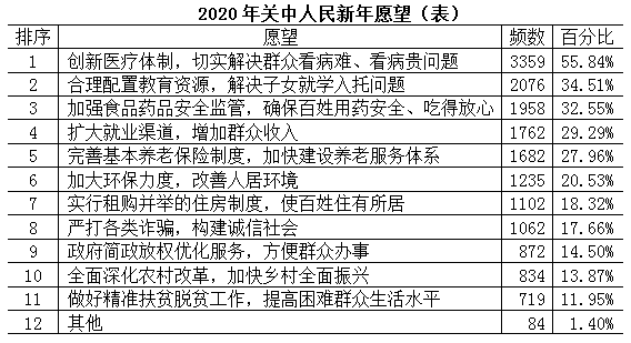 2020年,排在首位的愿望是“创新医疗体制,切实解决群众看病难、看病贵问题”,有5379条,占全部被调查者的53.67%,;排在第二位的愿望是“加强食品药品安全监管,确保百姓用药安全、吃得放心”,有3310条,占33.02%;排在第三位的愿望是“合理配置教育资源,解决子女就学入托问题”,有3253条,占32.46%。具体见下表: