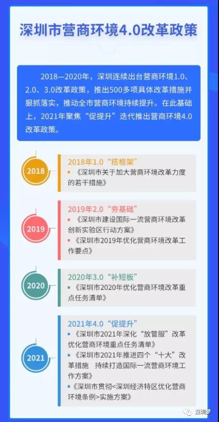 2021年6月,深圳市发布《深圳市2021年深化“放管服”改革 优化营商环境重点任务清单》《深圳市2021年推进四个“十大”改革措施 持续打造国际一流营商环境工作方案》《深圳市贯彻<深圳经济特区优化营商环境条例>实施方案》。