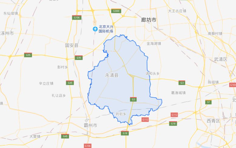 永清县隶属河北省廊坊市,位于河北中部,京、津、保三角地带中心,地处京畿重地、环渤海经济圈腹地,北距北京60多公里,东距天津60公里,距首都机场80公里,距天津新港100公里。县政府驻永清镇。永清县总面积776平方公里,辖14个乡镇、1个省级开发区,386个行政村,人口38.8万,既是一个传统农业县、新兴工业县和生态旅游县,还是京津地区最大的无公害蔬菜生产基地,域内建有北方最大的燃气工业区。