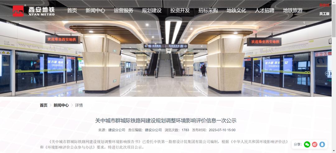 7月10日,西安地铁官网发布《关中城市群城际铁路网建设规划调整环境影响评价信息一次公示》,公布了3条城际铁路:阎良(富平)至机场、西安至法门寺城际铁路法门寺至绛帐段、西安至法门寺城际铁路眉县东至太白段。共计约123.4km,车站19座。
