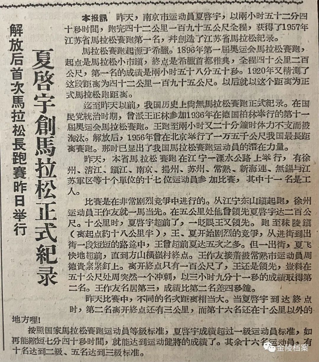 1957年11月25日,比赛次日,《新华日报》在头版刊登了题为《解放后首次马拉松长跑赛昨日举行 夏启宇创马拉松正式纪录》的新闻。报道指出,在此次长跑赛之前,“我国历史上尚无马拉松赛正式纪录”。
