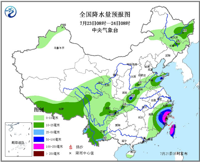 23日08时至24日08时,东北地区东部、黄淮东部和西部、江汉西北部、四川盆地西部和南部、云南西南部、西藏南部、浙江中南部、福建大部、江西东部以及台湾等地有中到大雨,其中,台湾、福建东北部、浙江东南部等地的部分地区有暴雨或大暴雨,局部特大暴雨(250~330毫米)。东海南部、台湾以东洋面将有9~11级的大风,“麦德姆”中心经过的附近海域风力可达12~13级、阵风14~15级。