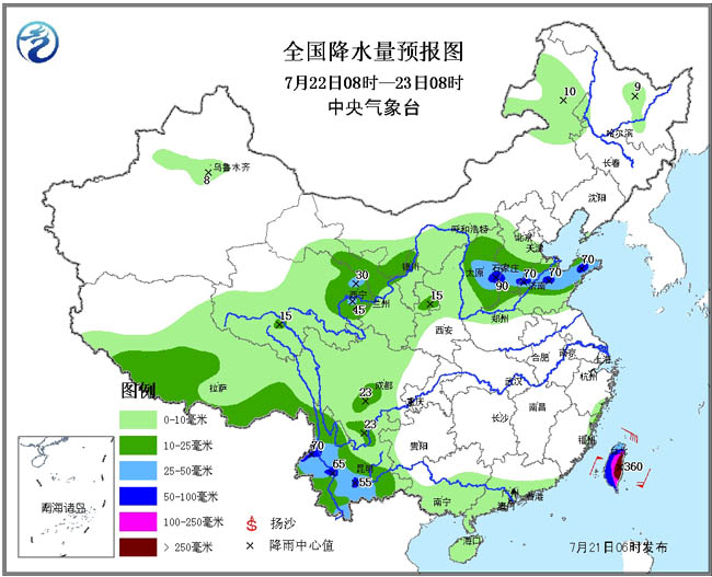 21日08时至22日08时,东北地区中东部、华北中南部、青海北部、甘肃西部、四川南部、云南等地有中到大雨,其中,辽宁北部和东部、吉林西南部、黑龙江东南部、云南中南部等地的部分地区有暴雨,局地大暴雨(100~120毫米),上述局部地区有短时雷雨大风等强对流天气。台湾以东洋面有6~7级、阵风8级的东北风,南海东北部将有6~7级、阵风8级的西北风。