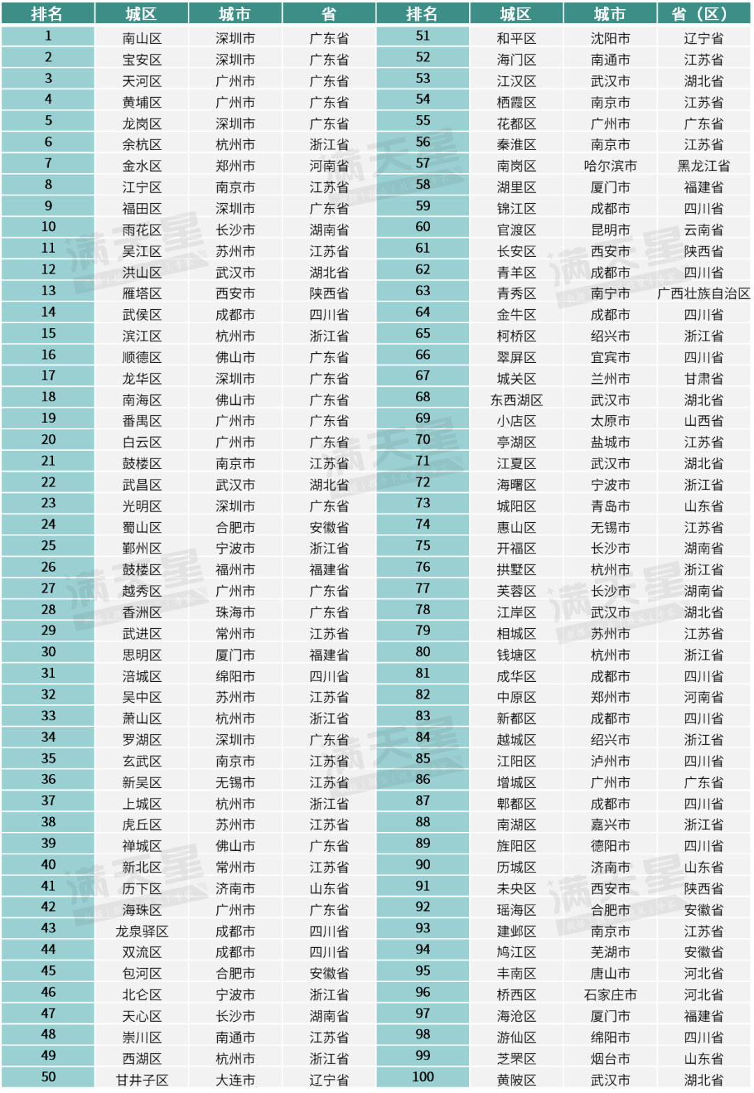 排名前十的城区分别是深圳南山区、深圳宝安区、广州天河区、广州黄埔区、深圳龙岗区、杭州余杭区、郑州金水区、南京江宁区、深圳福田区以及长沙雨花区。从省域分布来看,十强城区中,广东占六席,浙江、河南、江苏、湖南各占一席。