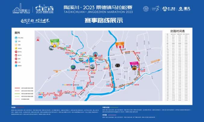 马拉松:望津府(景北大道北往南)—昌江大道(西往东)—陶溪川路(北往南)—景德大道(东往西)—沿江西路(南往北)—瓷都大道(南往北)—迎宾大道(南侧东往西逆行)—新平路(北往南)—珠山大道(东往西)—紫晶路(北往南)—龙井路(东往西)一新都大道(东往西)一梧桐大道(南侧东往西逆行再折返逆行)一梧桐大道(北侧西往东逆行)一景兴大道(西侧南往北逆行)一珠山大道(北侧西往东逆行)一紫晶路(西侧南往北逆行)一迎宾大道(东往西先逆行再顺行)一陶博城(全程42.195公里)