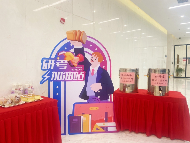 时光记录了备考的努力,每一个前行的梦想都值得托举。为给考生们提供更加温馨、舒适的考试环境,华理考点在各考区一楼设立了“研考加油站”,精心准备面包点心、姜茶等暖心热饮,为考生们加油鼓劲。为方便考生中午用餐和休息,学校向校外考生开放食堂、设置考生休息室,并安排医生值班、准备常用药物,为考生提供医疗保障等。
