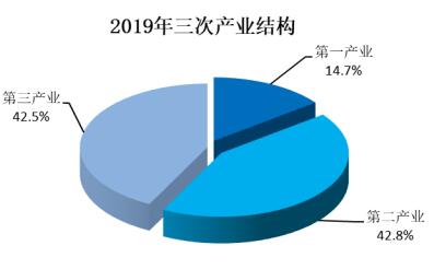 产总值中,第一、第二和第三产业增加值占比分别为14.7%、42.8%和42.5%。与2018年相比,第二产业增加值占比下降4.9个百分点,第一产业、第三产业增加值占比分别提高0.7个、4.2个百分点。