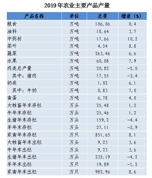 粮食播种面积380.40万亩,比上年减少0.57万亩;油料种植面积116.64万亩,增加0.14万亩;中药材种植面积126.26万亩,增加7.83万亩;茶园种植面积108.91万亩,增加4.64万亩;蔬菜种植面积95.78万亩,增加2.33万亩;园林水果种植面积52.07万亩,增加0.82万亩。