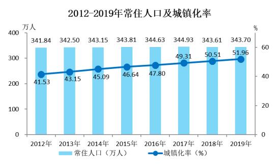 年末户籍总人口380.94万人,其中城镇人口142.64万人。年末常住人口343.70万人,出生率为9.30‰,死亡率为6.68‰,自然增长率为2.62‰,常住人口城镇化率为51.96%。