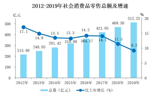 实现社会消费品零售总额512.25亿元,比上年增长9.2%。按经营单位所在地分,城镇消费品零售额412.19亿元,增长9.0%;乡村消费品零售额100.06亿元,增长9.6%。按消费形态分,商品零售444.30亿元,增长8.3%;餐饮收入67.95亿元,增长15.3%。