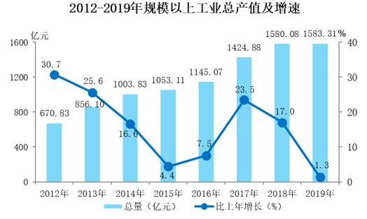 规模以上工业完成产值1583.31亿元,比上年增长1.3%。其中,轻工业完成产值502.39亿元,下降0.7%;重工业完成产值1080.91亿元,增长2.2%。全部工业增加值504.88亿元,增长4.7%,其中规模以上工业增加值增长4.8%。
