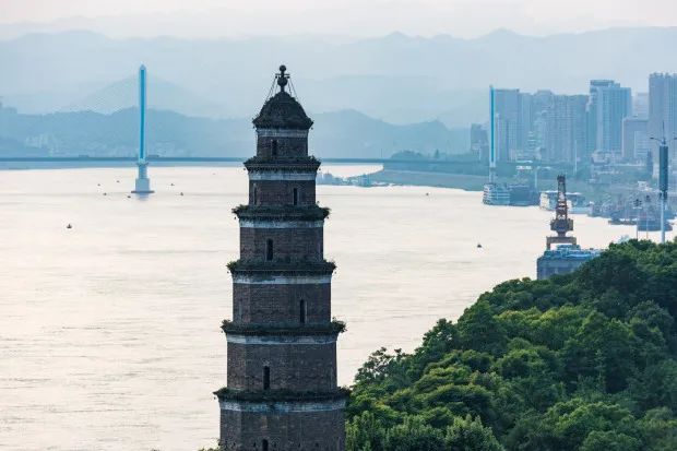 每当朝阳初起时,塔光山影倒映江面,宛如一条巨型钢鞭,压在五龙之上,因而又有“鞭打五龙”之称。