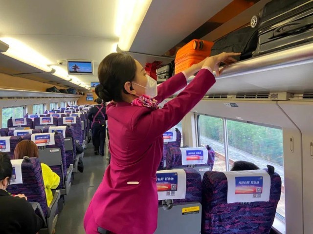 中国铁路北京局集团有限公司为保障进港列车高质量恢复开行,选派政治素养高、业务能力强、形象气质佳的高铁乘务人员值乘G305次列车。他们提前开展专题培训,重点组织学习广深港高速铁路跨境旅客运输组织规则,让旅客出行体验更美好。