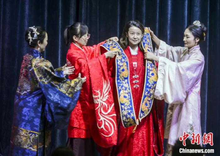 乌鲁木齐,汉服礼仪讲师帮助市民试穿明制汉服。刘新 摄
