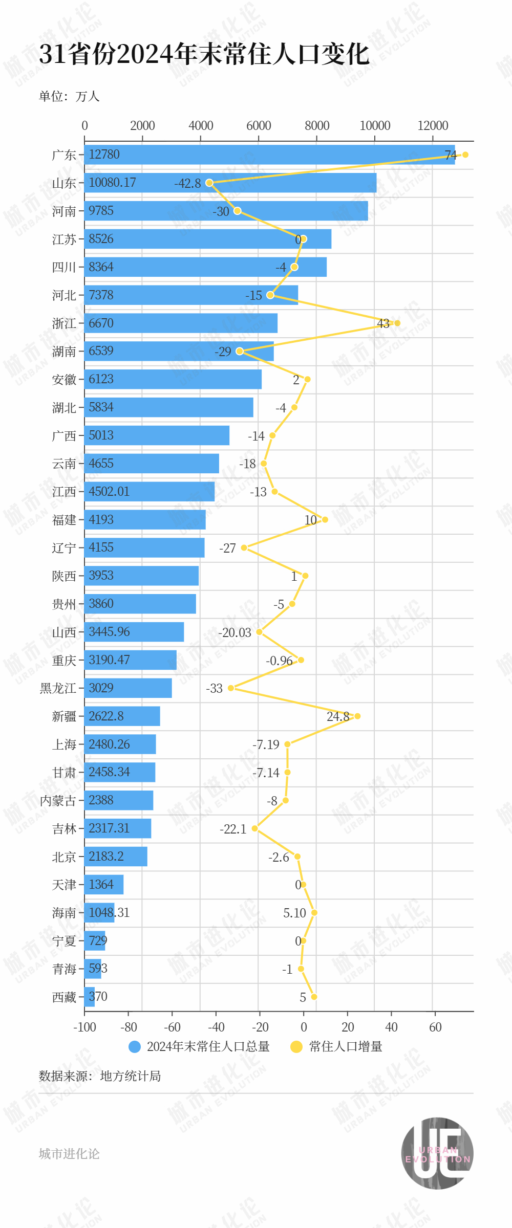 截至目前,全国31个省份均公布了2024年末常住人口规模数据。具体来看,8省份常住人口上涨,3省份维持不变,另有20省份出现下降。从地域分布来看,人口增长最多和下降最多的省份都在东部沿海——