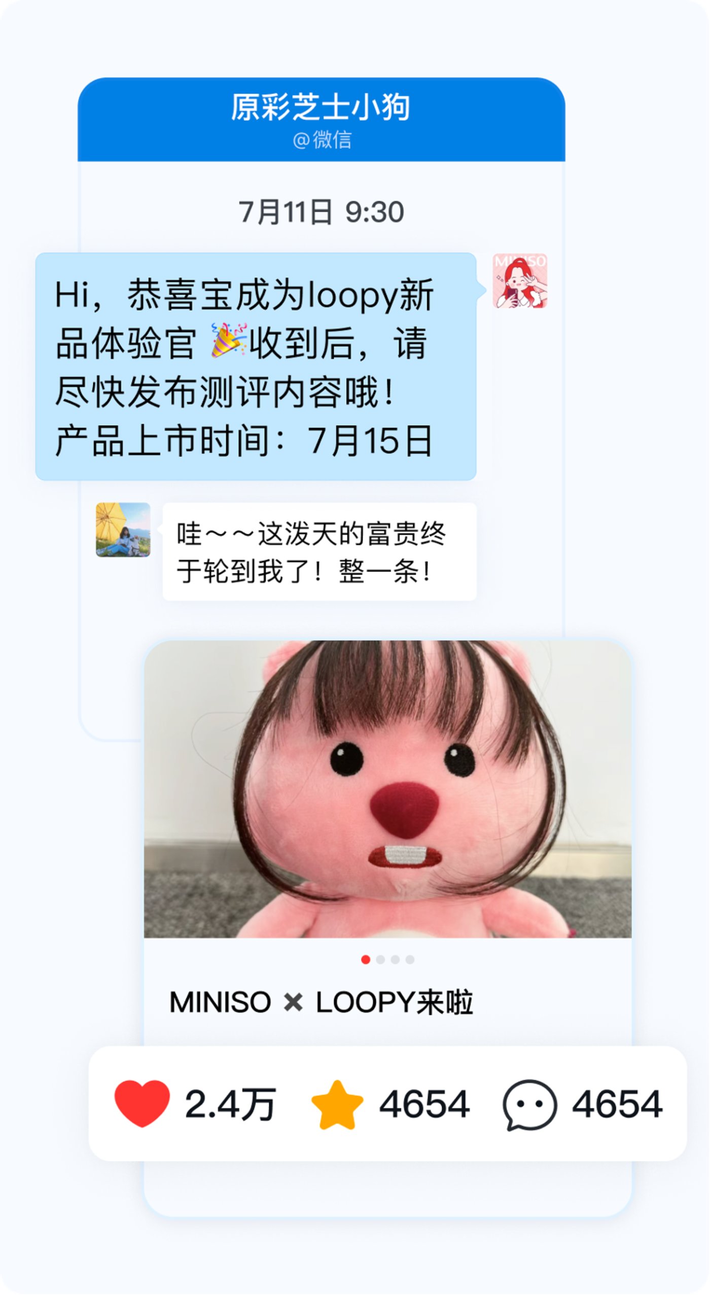 企业微信,让名创和生产内容的 KOC 建立了长久、共赢的关系,让好的内容不断被激发、被创造,才让名创优品的好产品被更多人看见,成为受粉丝喜爱的爆品,私域 KOC 让爆款的成功,不再是偶然。