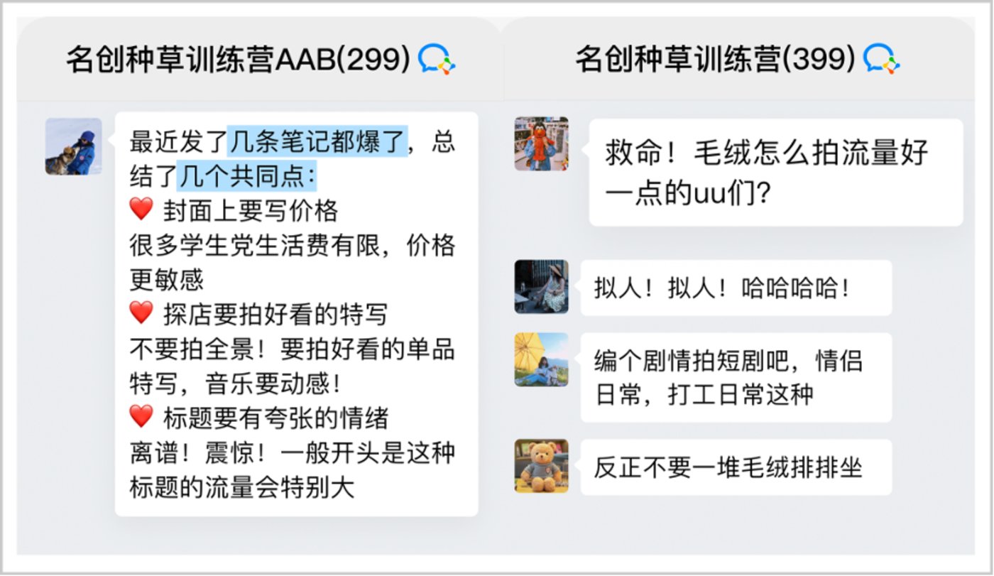 这个难题名创也摸索出了一些方法——不仅将观察到的“流量密码”投喂给私域KOC,名创还会邀请发过多篇爆款笔记的KOC成为“带教老师”,他们会追踪平台最新的热点、流量规则,以及自己总结的爆文模板,在私域KOC社群中分享给大家。