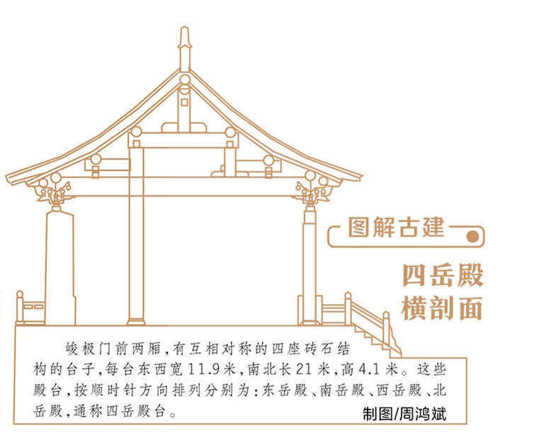杜启明介绍,中岳庙的轴线设计是中国五岳祠庙中最长的。今天的中岳庙,仅指其核心区即建筑部分,自汉代石阙起至黄盖峰重檐八角琉璃亭止,南北轴线达1.5公里。而以庙制为例,其山水形胜之轴,自中岳庙南的箕山,经中岳庙至庙北嵩顶峻极峰,南北轴线达20公里左右,其间层峦叠嶂,蔚为天下之大观。
