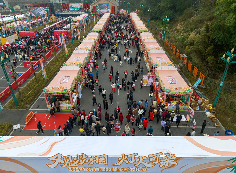 1月29日,人们在四川省宜宾市珙县巡场镇三合村年货购物节上参观、选购(无人机照片)。