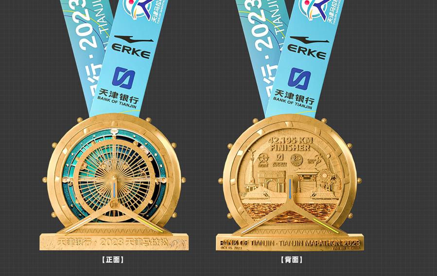奖牌设计理念:天津马拉松的奖牌设计采用国际化的视觉艺术思路,利用“同心园”结构,将天津最具有代表性、最具象征意义的“天津之眼”微缩抽象化,微型摩天轮镂空可转动,配合“科技之芯”的抽象图腾,增加了观赏性、立体度、交互感,是传统地标与科创艺术的完美结合。奖牌背面呈现出“天津印象”的微型浮雕,解放桥、民园主楼、世纪钟等著名地标生动美观,一目了然呈现出天津特色。