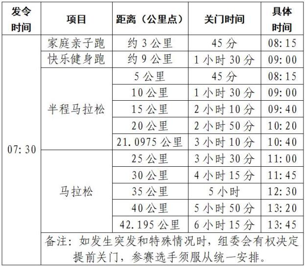 关门时间(以7:30发令枪声时间为准)具体见下表: