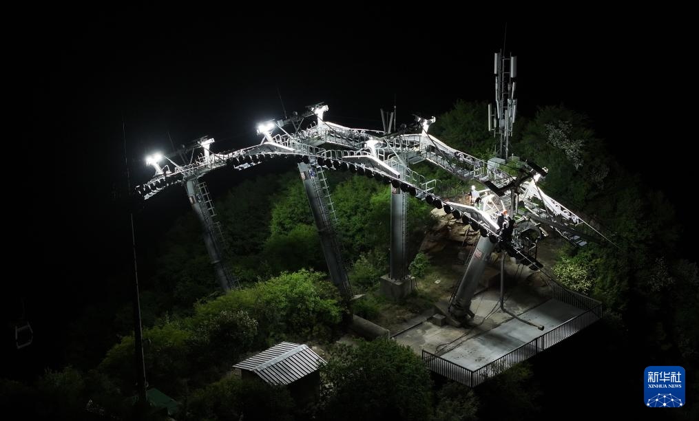 4月28日晚,机电维修工在华山西峰索道一座支架进行巡检作业(无人机照片)。