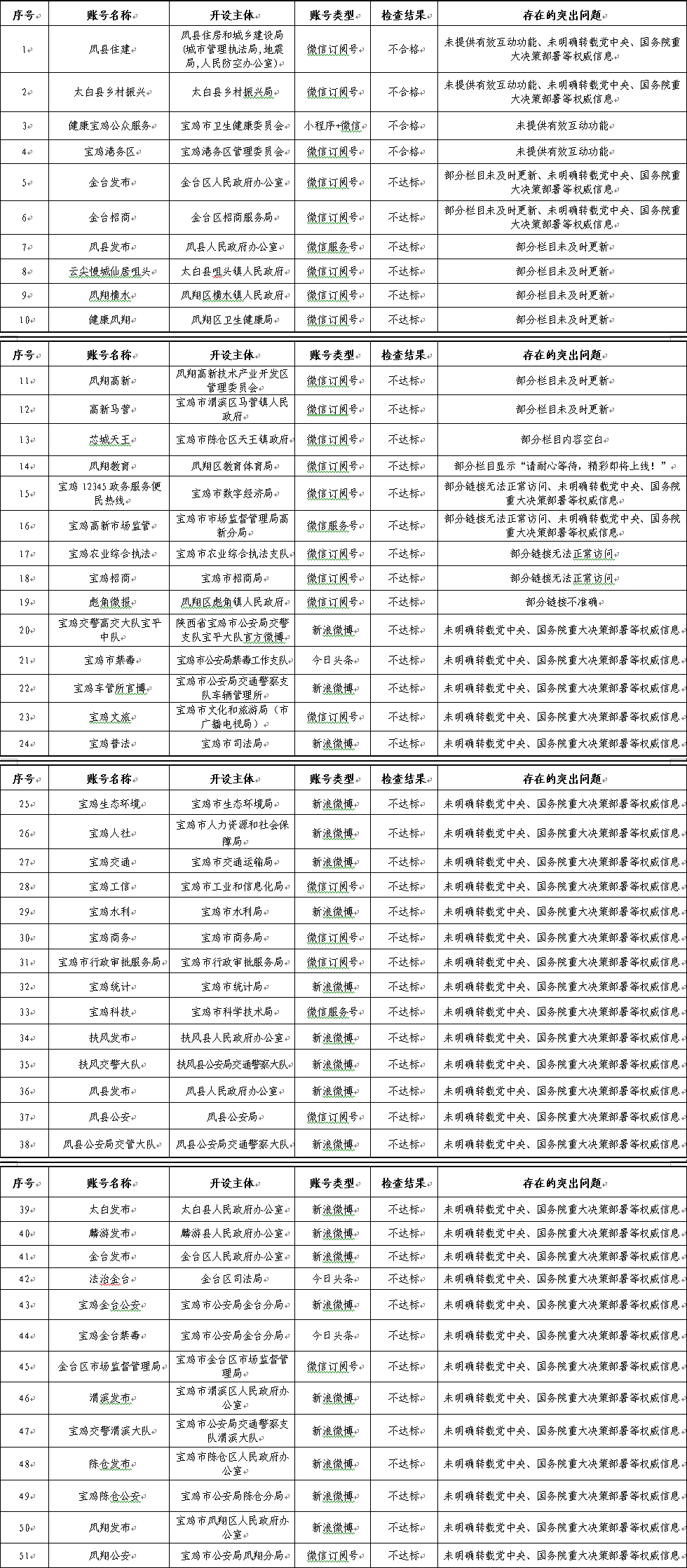 二季度,共抽查政务新媒体账号118个,其中合格114个、不合格4个,合格率为96.61%。不合格政务新媒体为:宝鸡港务区管理委员会“宝鸡港务区”、太白县乡村振兴局“太白县乡村振兴”、凤县住房和城乡建设局“凤县住建”等3个微信订阅号和市卫生健康委员会“健康宝鸡公众服务”小程序+微信。同时,对2024年第一季度存在问题的政务新媒体进行了复核,全部合格。