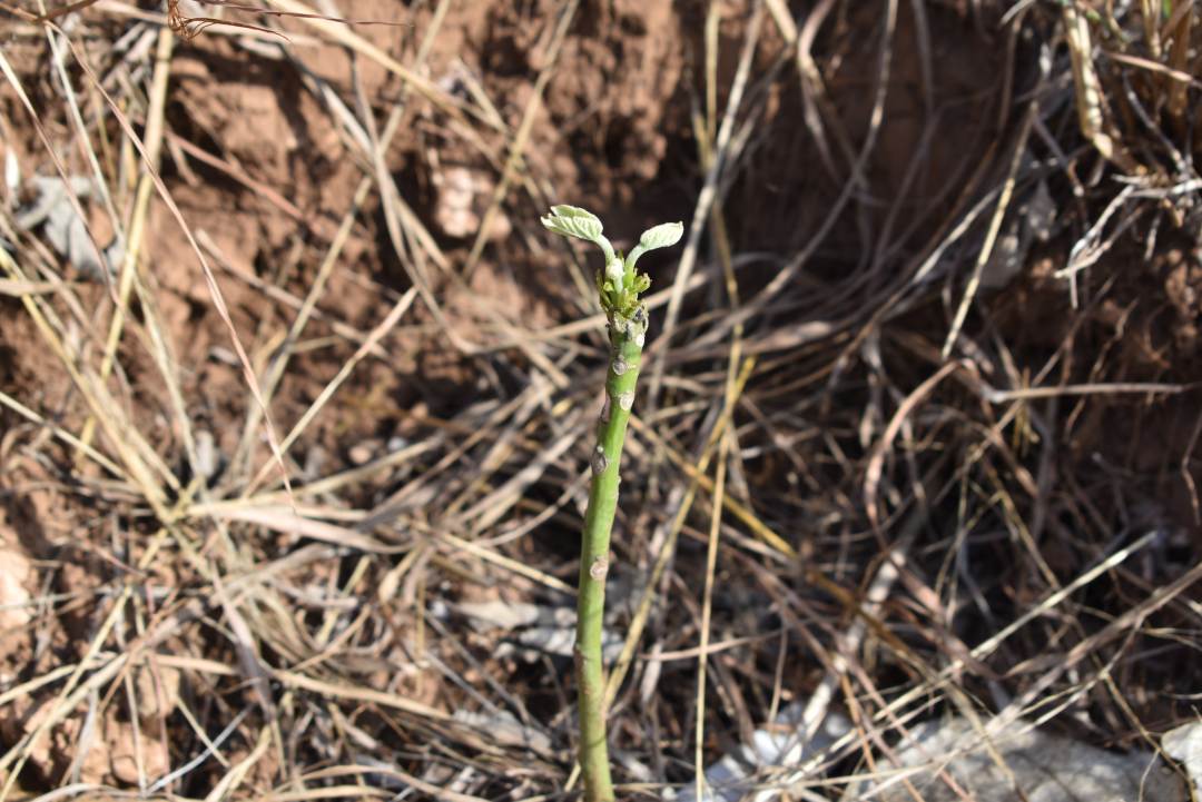 “我们当地人把云南梧桐叫作桐麻果,这个树也是怪得很,分布的4个地方都在岩石缝隙中,或是旁边有岩石的地方。在平日巡逻时我特别观察了一下,周围也不见种子自然繁殖的小苗。”迎着春日暖阳,远远看去,云南梧桐大部分树杆裸露着,零星吐出嫩绿的新叶星星点点,树梢上紫红色花穗正沐浴在阳光下随风轻摆着,树的周围依稀能见到堆积许久干枯的梧桐树叶。“这个就是去年9月份种下的,当时苗太小,天气又干燥,我以为怕是种不活,没想到还是活下来了。”老肖一边说一边小心翼翼刨开树塘里的树叶和杂草,一棵棵刚吐露出嫩叶的幼小云南梧桐展现眼前。