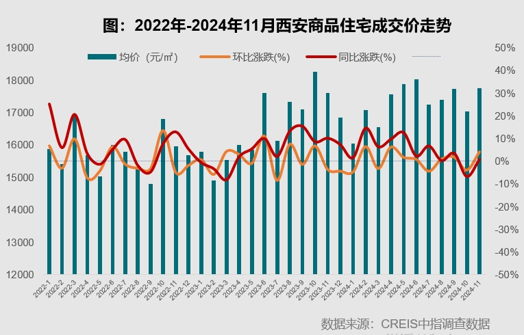 从成交价来看,据中指研究院数据,2024年1-11月,西安商品住宅成交均价17036元/平方米,环比上涨4.16%,同比上涨3.79%。其中,11月份成交价环比上涨4.16%。