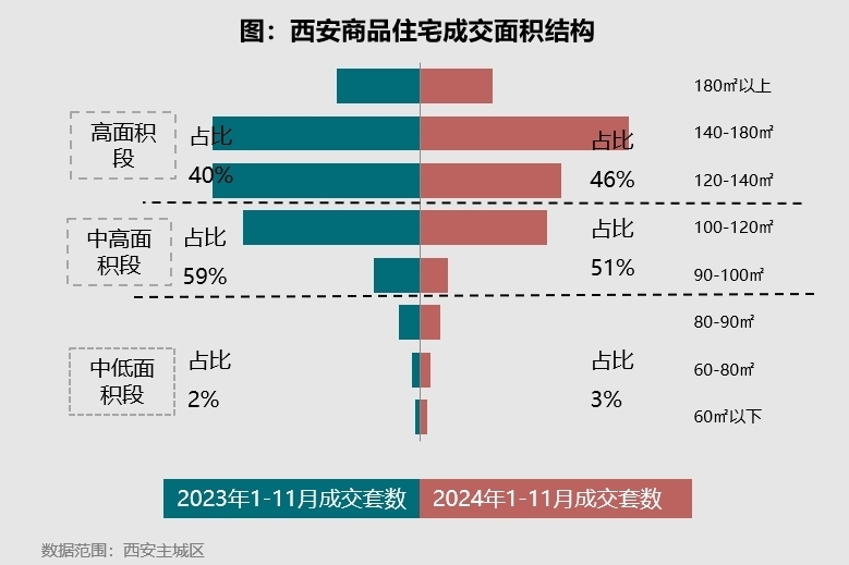 中指研究院研报表示,2020年以来,西安新房的成交面积段略有上移。到2023年末,120-160平方米的改善产品已成为成交主力,成交总价则上移集中至150万-200万、300万以上两段。改善型项目销售相对较高,甚至出现了“越贵越摇”的现象。进入2024年,改善产品成为西安新房成交主力的现象更为凸显。今年1-11月,140平方米户型成交套数的占比同比上涨了6个百分点,主城区改善化格局基本形成;价格上,200万元以上产品的占比超过69%,其中,300万元以上的中高价位产品成交占比也增长了5个百分点。