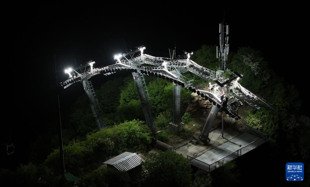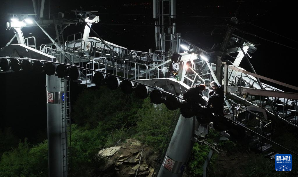 4月28日晚,机电维修工在华山西峰索道一座支架进行巡检作业(无人机照片)。新华社记者 张博文 摄