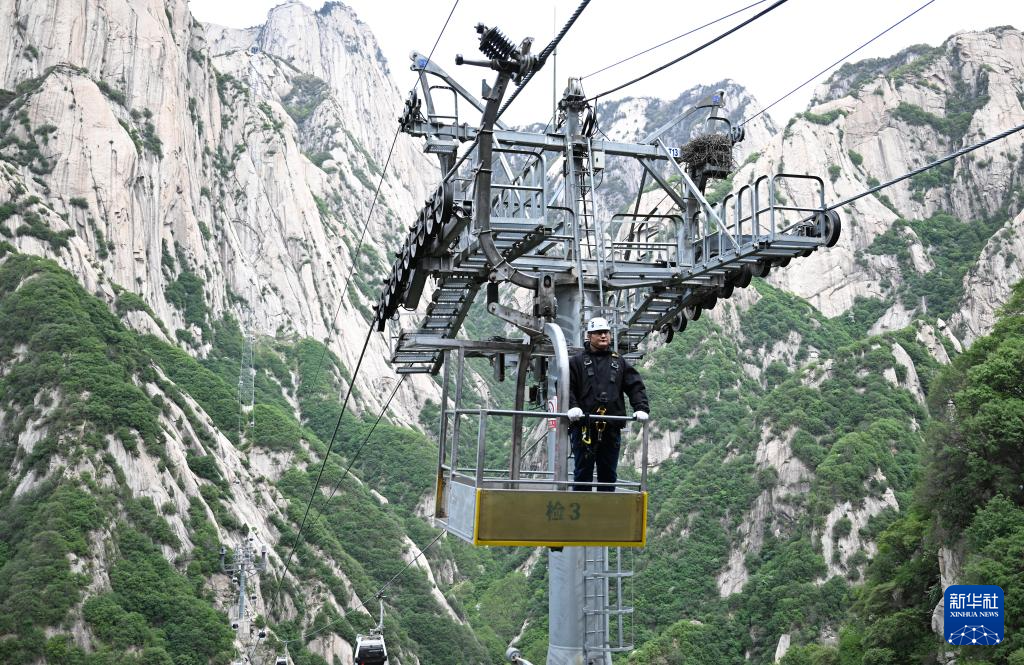 4月29日,机电维修工在华山西峰索道进行巡检作业。新华社记者 张博文 摄