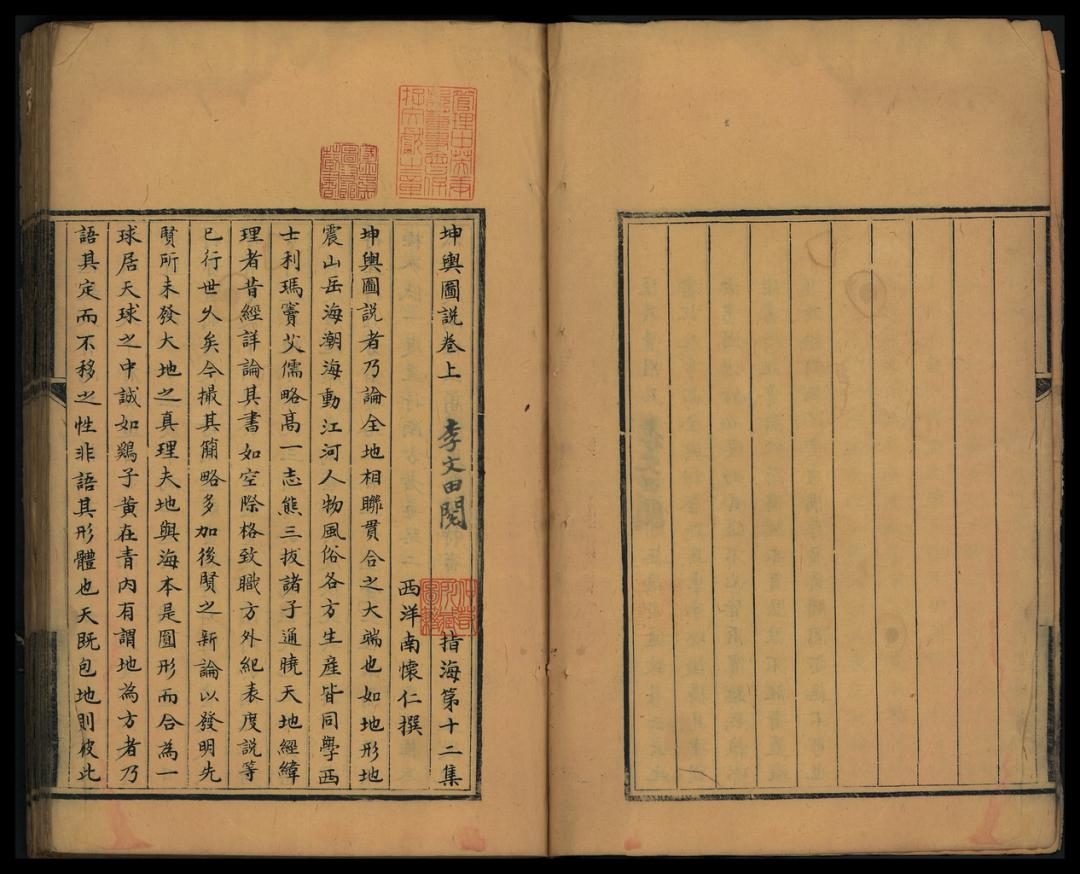 随后又与蒋友仁刊印《坤舆图说》,分二卷,以作说明。上卷论述自然地理,地体之圜,地月关系、南北两极、地震、山岳、海水之动、潮汐、江河、气行、风、云、雨、四元行之序并其术、人物等十余章。下卷载国外诸国城池山川风土物产,分亚细亚、欧罗巴、利未亚(即非洲)、南北阿墨利加(美洲)五大洲,附珍禽异兽图说 25 幅,而终之以西洋七奇图说,及其与人文地理之关系,颇可增广当年国人之“异闻”。