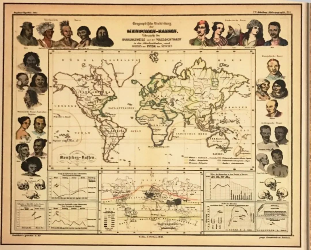 19世纪德国人贝格豪斯绘制的《自然地图集》是世界上最早出版、内容较完善的专题地图集,这本自然地理综合地图集包括地质地形、气象气候、水文、地磁、植物地理、动物地理、人种民族等专题内容。