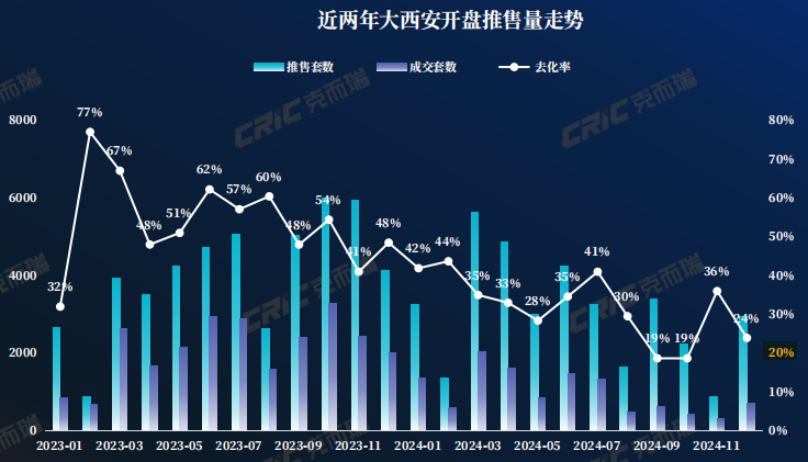 但我们发现一个微妙信号是,西安的改善楼盘似乎也不太好卖了——2024年度新房开盘去化率32%,同比降低20%。2024年新房成交量也呈现下降趋势,近两年大西安开盘推售量走势显示,2023年2月开盘去化率达到77%高峰,此后震荡走跌,2024年12月仅为24%。