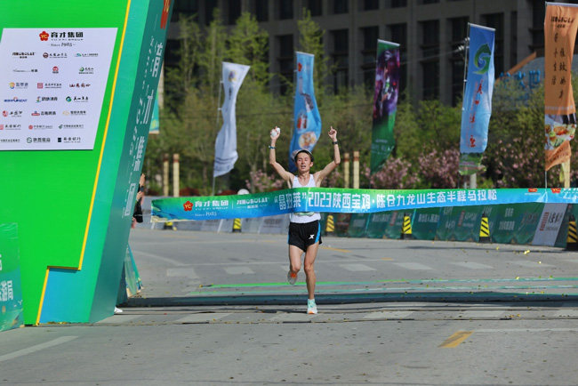 4月16日,2023陕西宝鸡·陈仓九龙山生态半程马拉松在九龙山景区鸣枪起跑,来自全国各地的8000多名专业运动员和跑步爱好者参加比赛。