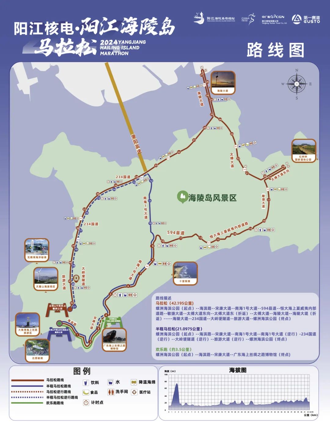 阳江核电·2024阳江海陵岛马拉松设置全程马拉松(42.195公里)、半程马拉松(21.0975公里)和欢乐跑(约3.5公里)三个项目,赛事起点设在大角湾螺洲海滨公园,途经海陵岛大角湾海上丝路旅游区、广东海上丝绸之路博物馆2个国家5A级旅游景区,打卡宋康大道、望海亭、海陵大堤等多个网红地标点。