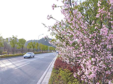 3-4月正值海棠花的花期,紫霄大道上的海棠花竞相盛开,一朵朵一簇簇的海棠花俏丽枝头,层层叠叠,灼灼灿灿,红如胭脂、粉如朝霞,为春天带来浪漫的色彩。
