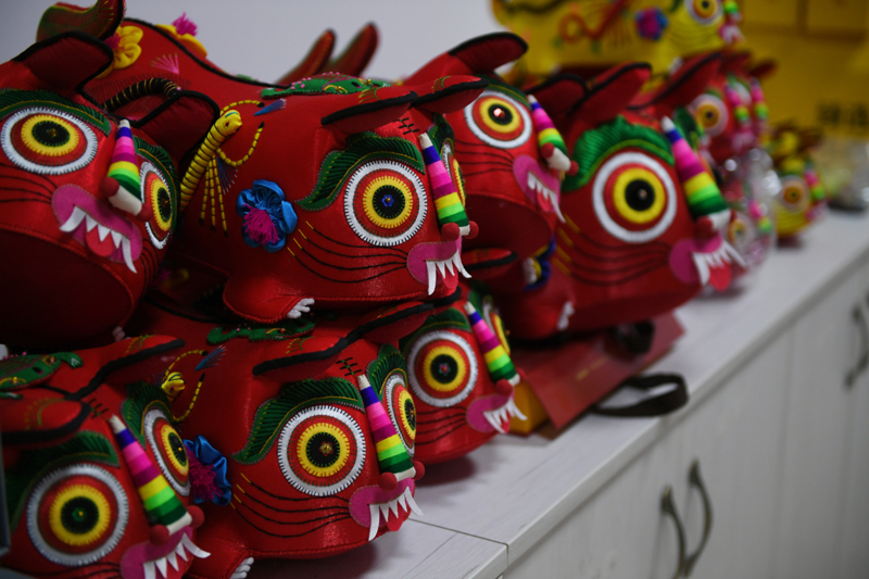 这是9月8日在宝鸡西秦刺绣文化产业园拍摄的刺绣手工艺品“五毒虎枕”。
