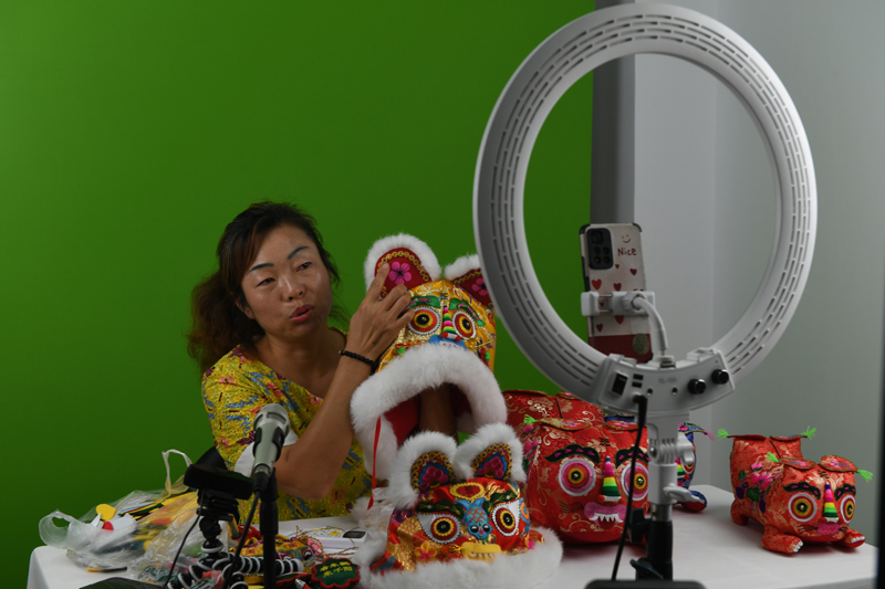 9月8日,在宝鸡西秦刺绣文化产业园,千阳绣娘在直播间推广刺绣手工艺品。陕西千阳县是国家级非物质文化遗产“西秦刺绣”的重要发祥地和传承地。近年来,千阳县将西秦刺绣作为助农增收的重要产业,推动非遗项目产业化发展,助力乡村振兴。