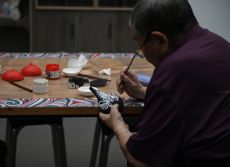 9月8日,在陕西宝鸡市西府里文化艺术村,中国工艺美术大师、陕西省非物质文化遗产社火脸谱绘制技艺代表性传承人李继友在绘制马勺脸谱。