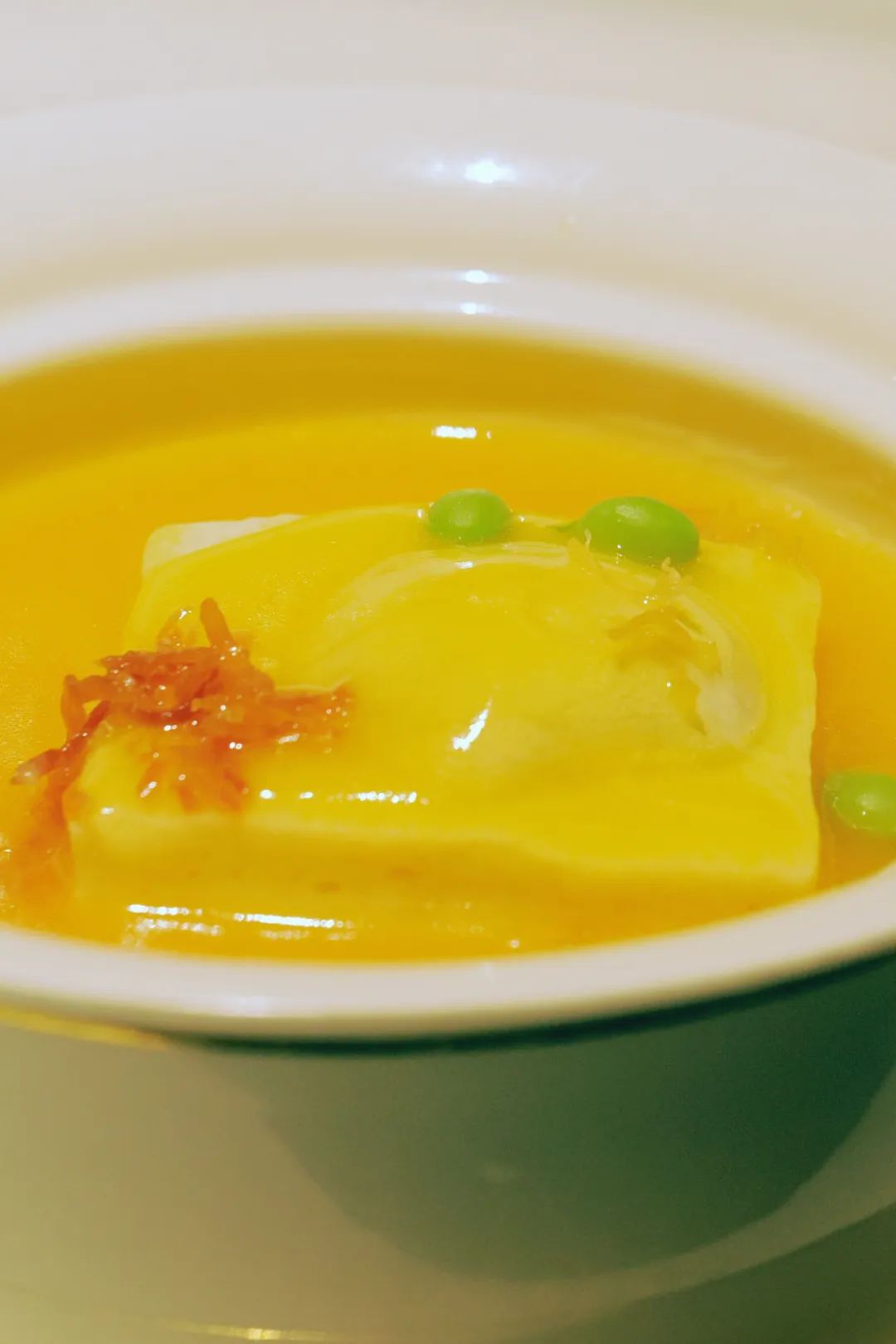 将去掉粗皮的豆腐芯,用30目滤网里过筛压成茸,再将鱼肉用手搅打成鱼茸,需要打两遍,这样鱼肉的肌肉组织才不会被破坏,而鱼茸却又细腻而融洽地与豆腐融为一体;随后将豆腐茸和鱼肉茸与鸡汤、蛋清等拌匀蒸至成型。都说“唱戏的腔,厨子的汤”,再用老母鸡、猪骨、瑶柱、干贝、五花肉等珍贵食材熬制10小时后,原材料功成身退,只取制成的浓郁高汤,浇汁在豆腐上。