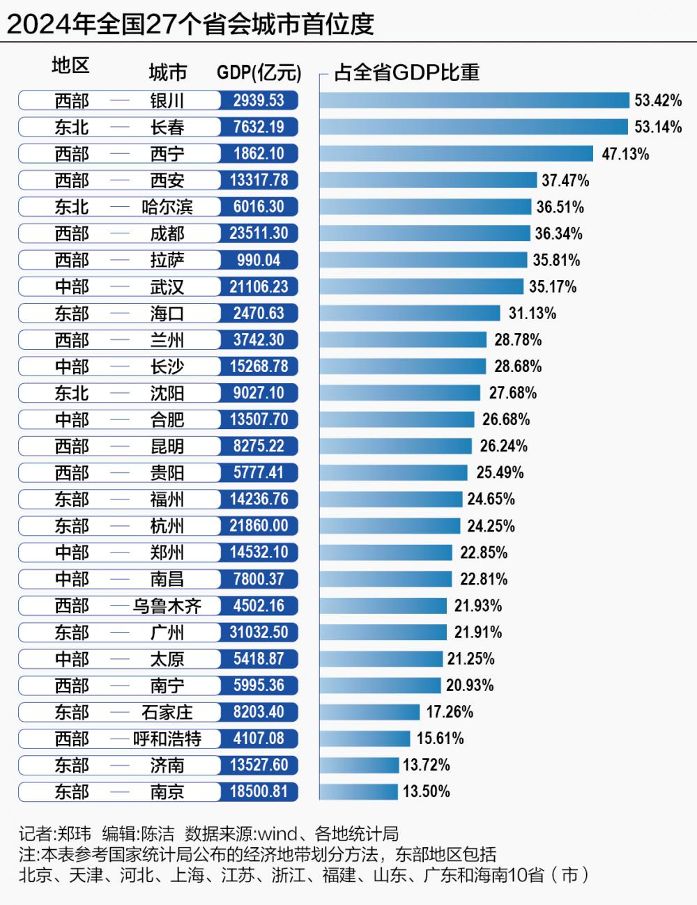 2024年,我国27个省会(首府)的首位度(即省会GDP占全省的比重)出炉,东部省份的省会城市呈现出明显的特征。