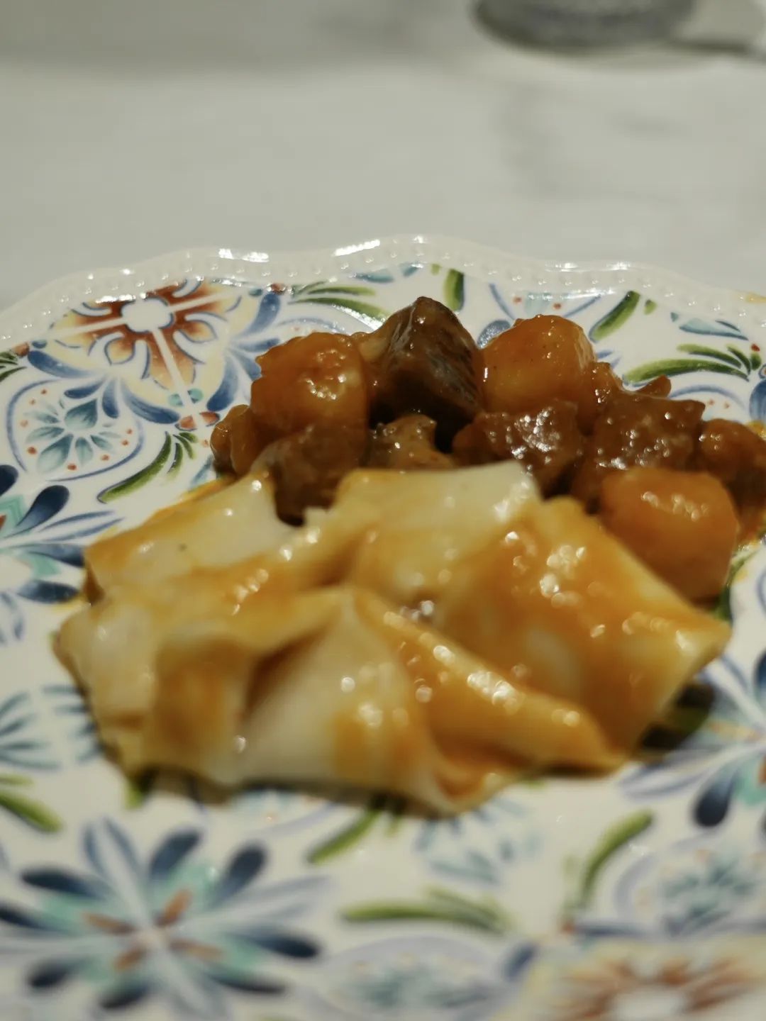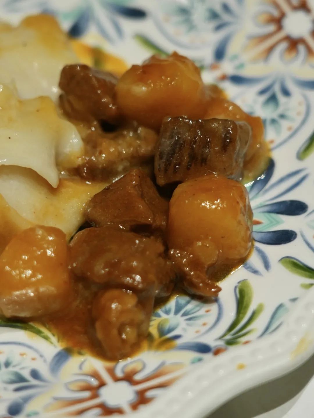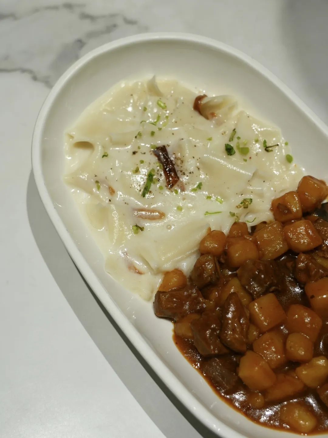 炖烂的牛肉泛着油光,吃起来瘦而不柴,丝丝儿甜的奶油混搭土豆牛肉的咸香。既有西北的豪迈,又融合了西餐的细腻,感觉像在吃“奶油意面”。