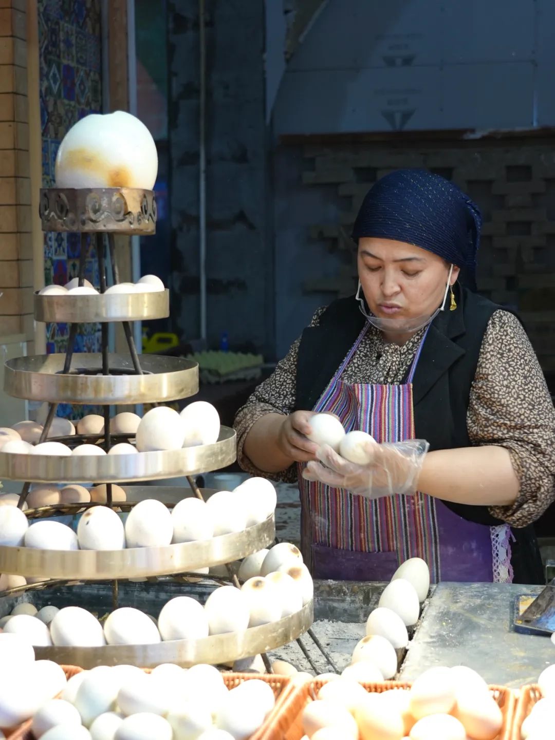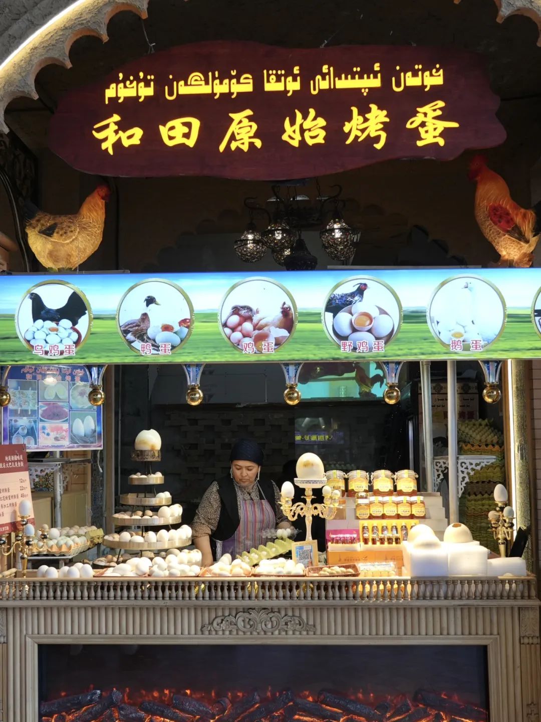 我在乌鲁木齐遇见的这家,也从和田而来。大大小小的各类蛋,堆起来像是“金字塔”。鸡蛋、鹅蛋、鸭蛋,小到鸽子蛋,大到鸵鸟蛋,万蛋皆可烤。